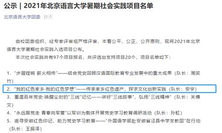 6月21日,2021年北京语言大学暑期社会实践项目名单公示。我院申报的项目《我的红色家乡▪我的红色梦想——传承家乡红色遗产,探求文化创新实践》成功入选。