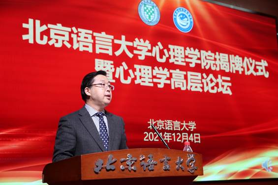 2021年12月4日,北京语言大学心理学院揭牌仪式暨心理学高层论坛在逸夫报告厅隆重举行。学校党委副书记、校长刘利教授出席揭牌仪式并致辞。揭牌仪式由学校党委副书记、纪委书记马贵生同志主持。