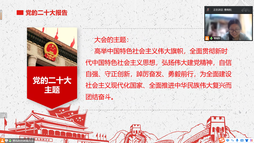 首先,团支书曹雨彤介绍了二十大召开的时间、背景以及基本内容。大会的主题是高举中国特色社会主义伟大旗帜,全面贯彻新时代中国特色社会主义思想,弘扬伟大建党精神,自信自强、守正创新,踔厉奋发、勇毅前行,为全面建设社会主义现代化国家、全面推进中华民族伟大复兴而团结奋斗。大会强调,中国共产党的中心任务是团结带领全国各族人民全面建设社会主义现代化强国、实现第二个百年奋斗目标,以中国式现代化全面推进中华民族伟大复兴。