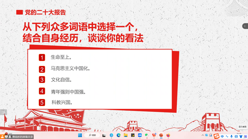 曹雨彤展示出了二十大报告里的五个关键词汇,并让同学们选择其中一个词,结合自身看法聊聊对这些词的认识。李薇雅看到“青年强则国强”感慨万千,青年是一个民族的未来,也是国家的希望,我们青年一代应当砥砺前行,为民族和国家的发展做出自己的一份贡献。曹雨彤也针对关键词“生命至上”发表了自己的见解:现在疫情形势严重,跟我们每个人的生命安全息息相关,我们应当积极配合当前防疫工作,理解防疫政策。