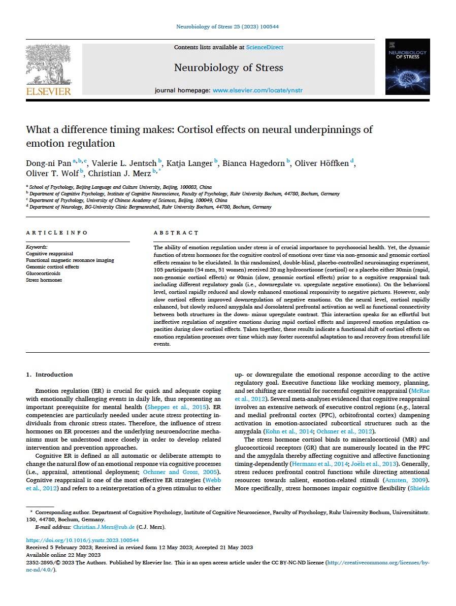 该成果系潘东旎老师与德国波鸿鲁尔大学认知心理学实验室Oliver T. Wolf 教授、Christian J. Merz教授等合作完成,研究受到中德双方共同资助。