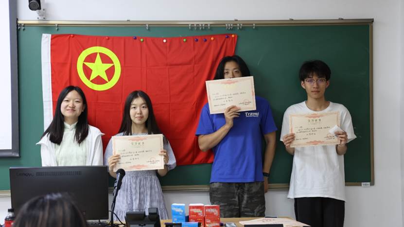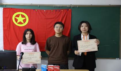 经过商讨和打分,共选出了共7位优秀部员,并由各部门部长颁奖。他们分别是——宣传部:张子涵、董作福、童钰佳,组织部:于孜诺、文琪,实践部:迪丽努尔、李秦萱。