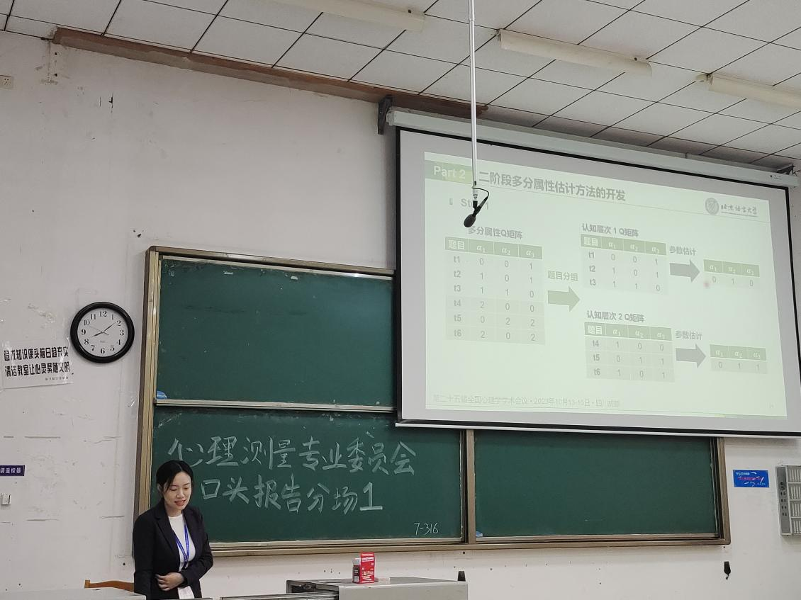 韩雨婷老师在“心理测量专业委员会”口头报告分场上担任主持人,并做了题为“二阶段多分属性估计方法:突破大规模标准化考试中多分属性认知诊断的计算挑战”(作者:韩雨婷、江哲涵)的报告。
