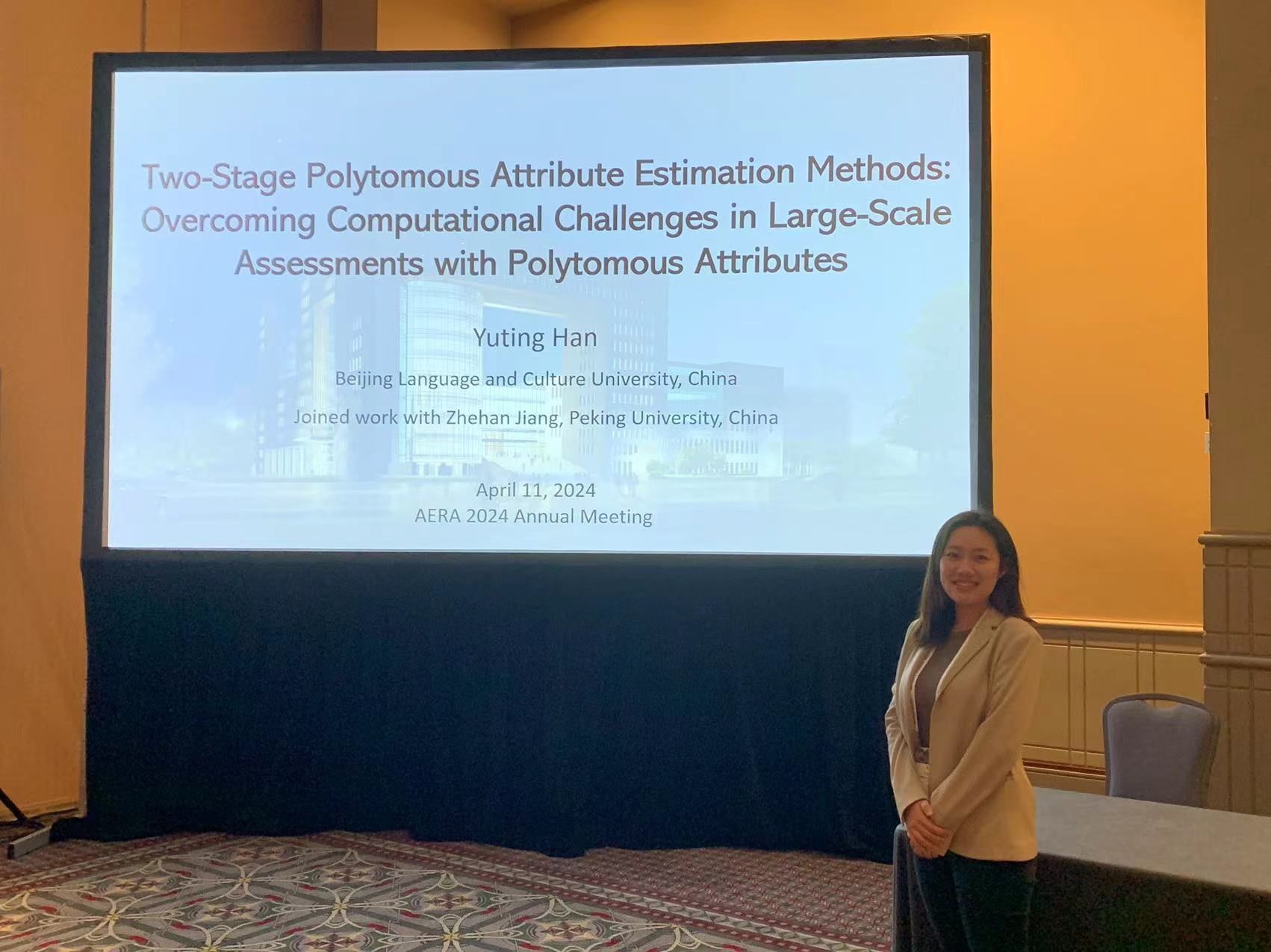 在“教育测量和研究方法”专题报告会上,韩雨婷博士做了题为“Two-Stage Polytomous Attribute Estimation Methods: Overcoming Computational Challenges in Large-Scale Assessments With Polytomous Attributes”的口头报告,就如何在大规模测评中进行多分类属性估计进行了介绍,引起了与会者的关注和热烈讨论。