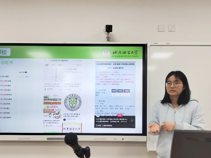 李子怡同学分析了心理学自命题和统考的差异,向大家演示了如何运用“研招网”搜集信息,并分享了自己的各类学习资源,最后建议同学们在复习过程中注重理解、勤于总结。