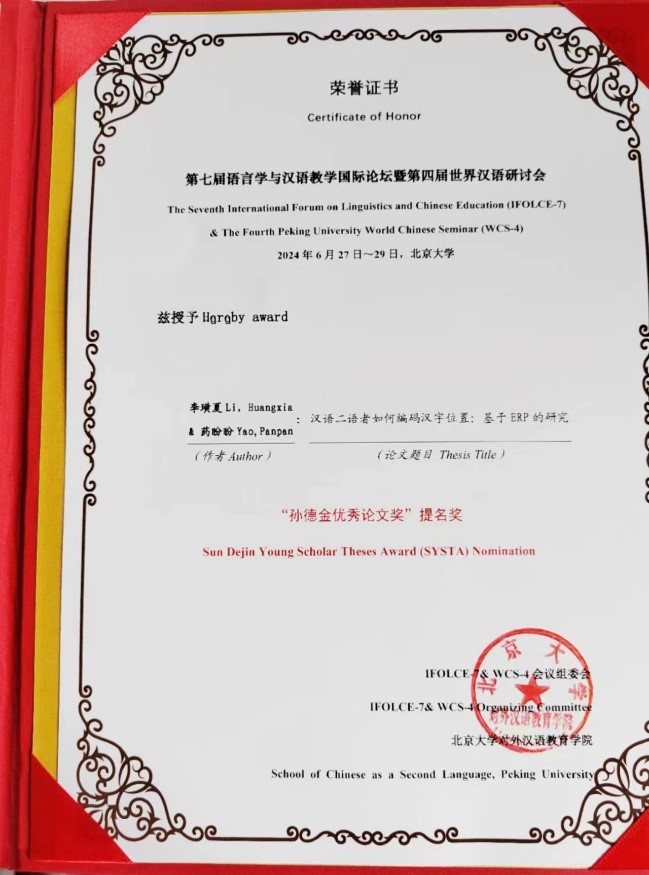 李璜夏和导师药盼盼副教授合作的论文荣获“孙德金青年优秀论文奖”提名奖。此次会议从从三十余篇论文中遴选出3篇论文,颁发“孙德金青年优秀论文奖”(Sun Dejin Young Scholar Theses Award; SYSTA)(其中2篇为提名奖)。北京大学对外汉语教育学院赵杨院长为获奖者颁奖。
