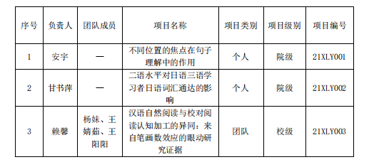 为培养研究生的创新能力,提升研究生培养质量,鼓励研究生参与科研创新,心理学院经研究决定设立“北京语言大学心理学院研究生创新基金项目”(以下简称“院级研究生创新基金项目”),将校级研究生创新基金项目未获立项、但在评审过程中得到评审专家“建议立项”推荐的项目,设立为院级研究生创新基金项目并予以经费资助;对以团队形式申请获批校级研究生创新项目的,视具体情况予以一定的配套经费资助。