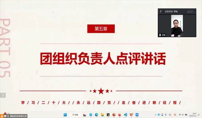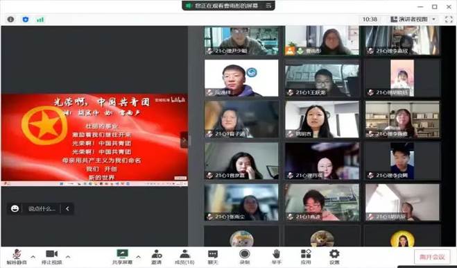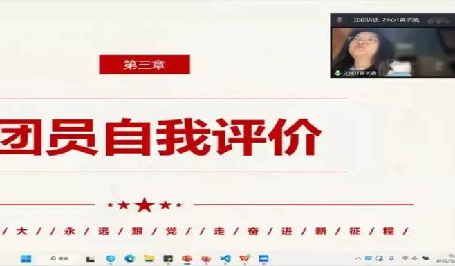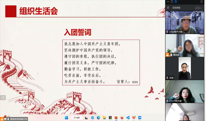 首先,团支书曹雨彤带领团员们奏唱团歌,每位同学都打开了摄像头,团歌节奏铿锵、歌声激昂,同学们立刻肃然起敬。