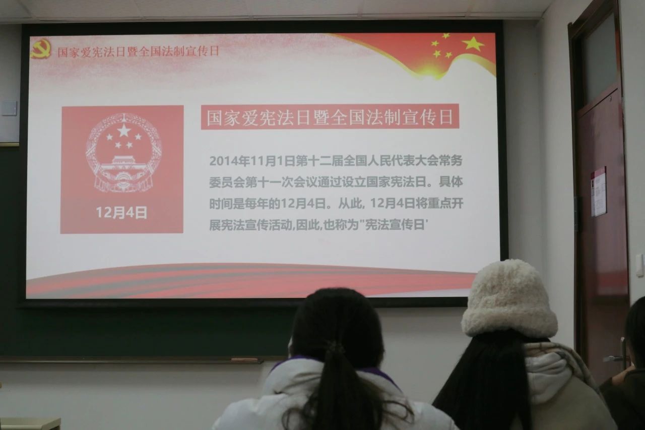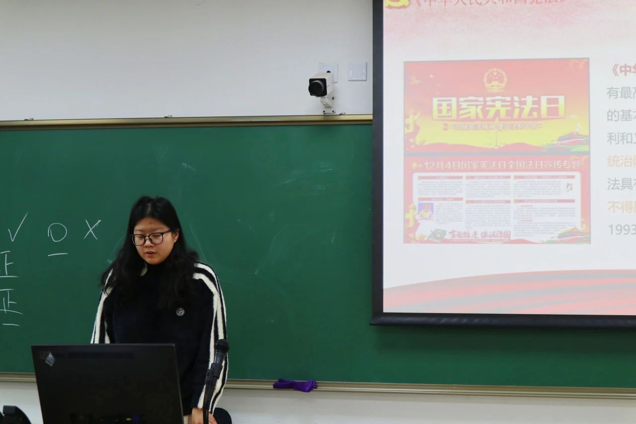 接下来,团支书曹雨彤向大家介绍了国家宪法日(即国家法制宣传日)的由来。2012年12月4日,习近平总书记在首都各界纪念现行宪法公布施行30周年大会上指出:“全面贯彻实施宪法,是建设社会主义法治国家的首要任务和基础性工作”。在习近平总书记的号召下,她鼓励同学们带领身边的亲人朋友学宪法,讲宪法,落实宪法宣传实效。