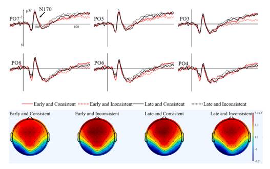 图3. L2 AoA、半球和正字法-语音声母一致性之间的交互作用,在N170上的平均波幅图(上)和地形图(下)
