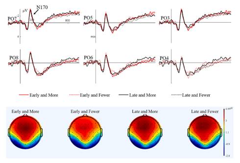 图2. L2 AoA、半球和正字法邻居之间的交互作用,在N170上的平均波幅图(上)和地形图(下)